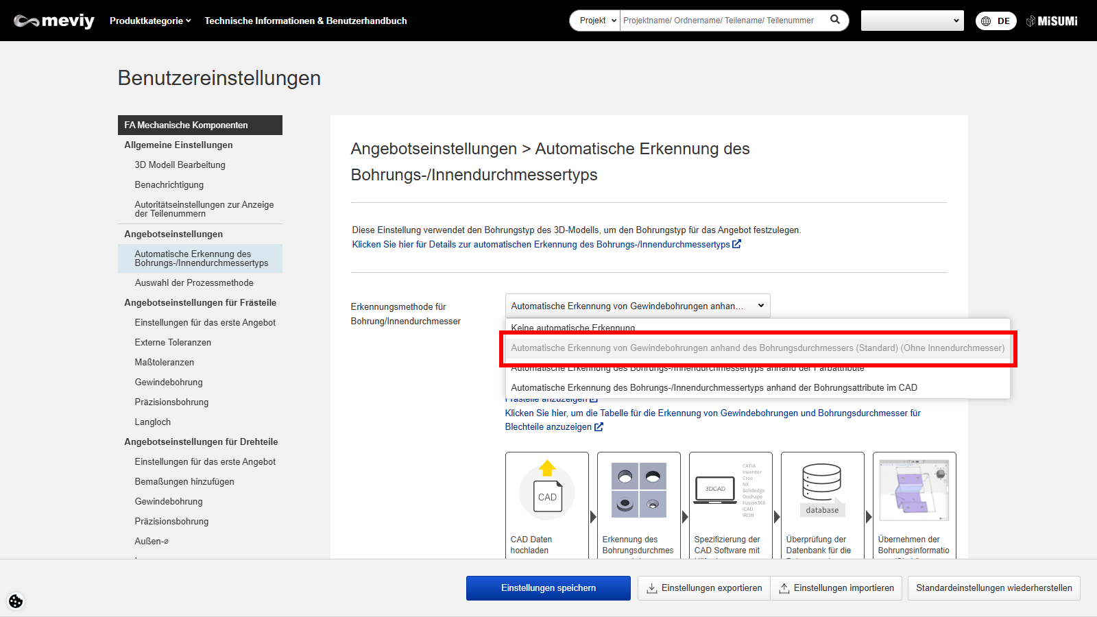 - Bitte wählen Sie Ihre CAD-Software als Voraussetzung für den Bohrungsdurchmesser zur Erkennung von Gewindebohrungen.