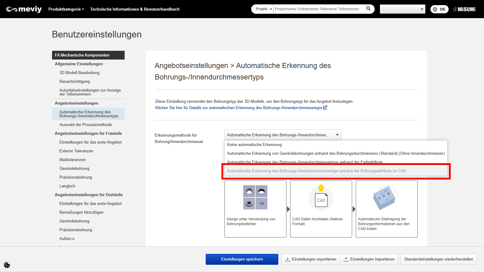 Hier finden Sie Informationen zum Einstellen der Bohrungserkennung für iCAD.