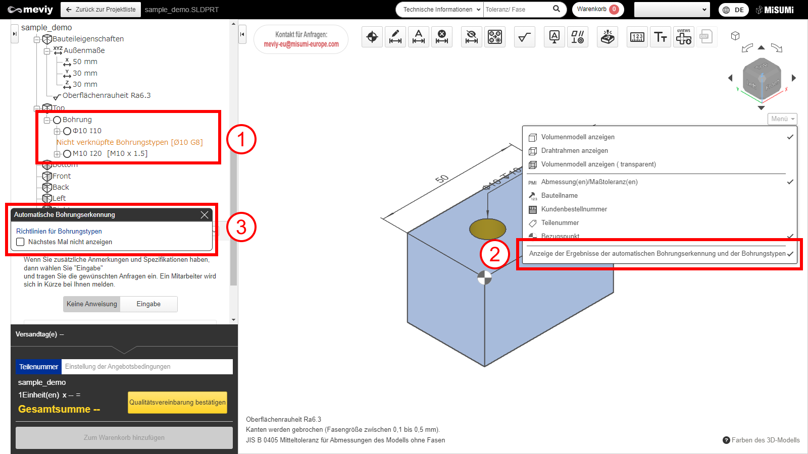 - Die Spezifikationen für Gewinde- oder Präzisionsbohrungen können nach dem Hochladen der CAD-Daten geändert werden, indem der 3D-Viewer-Bildschirm über [Weiter] geöffnet wird und ein Doppelklick auf die Bohrung erfolgt.