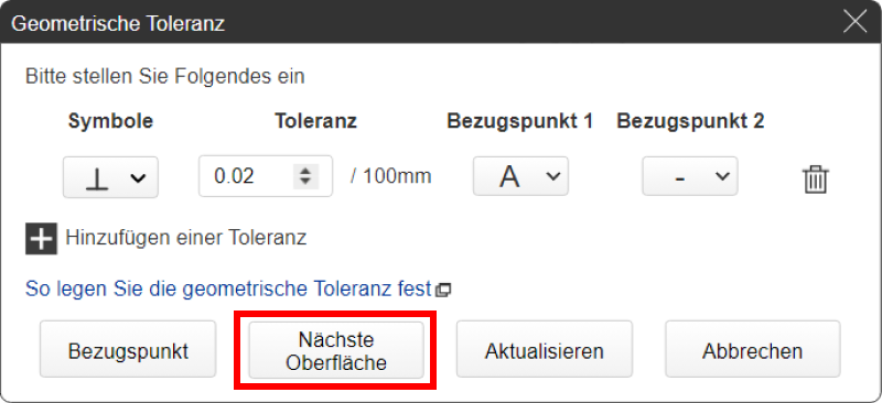 - Wenn Sie auf die Schaltfläche “Nächste Fläche auswählen“ klicken, ohne auf “Aktualisieren“ zu klicken, können Sie eine neue geometrische Toleranz auf einer anderen Fläche festlegen.