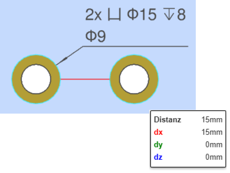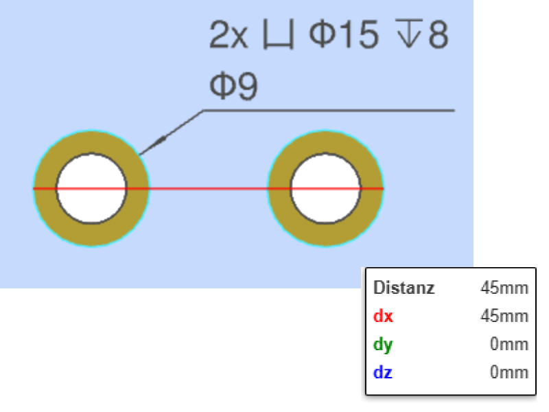 - →Wenn Sie den Mauszeiger über die zu messenden Punkte (Kanten und Flächen des Modells) bewegen,
