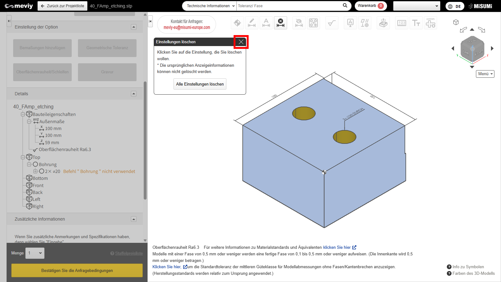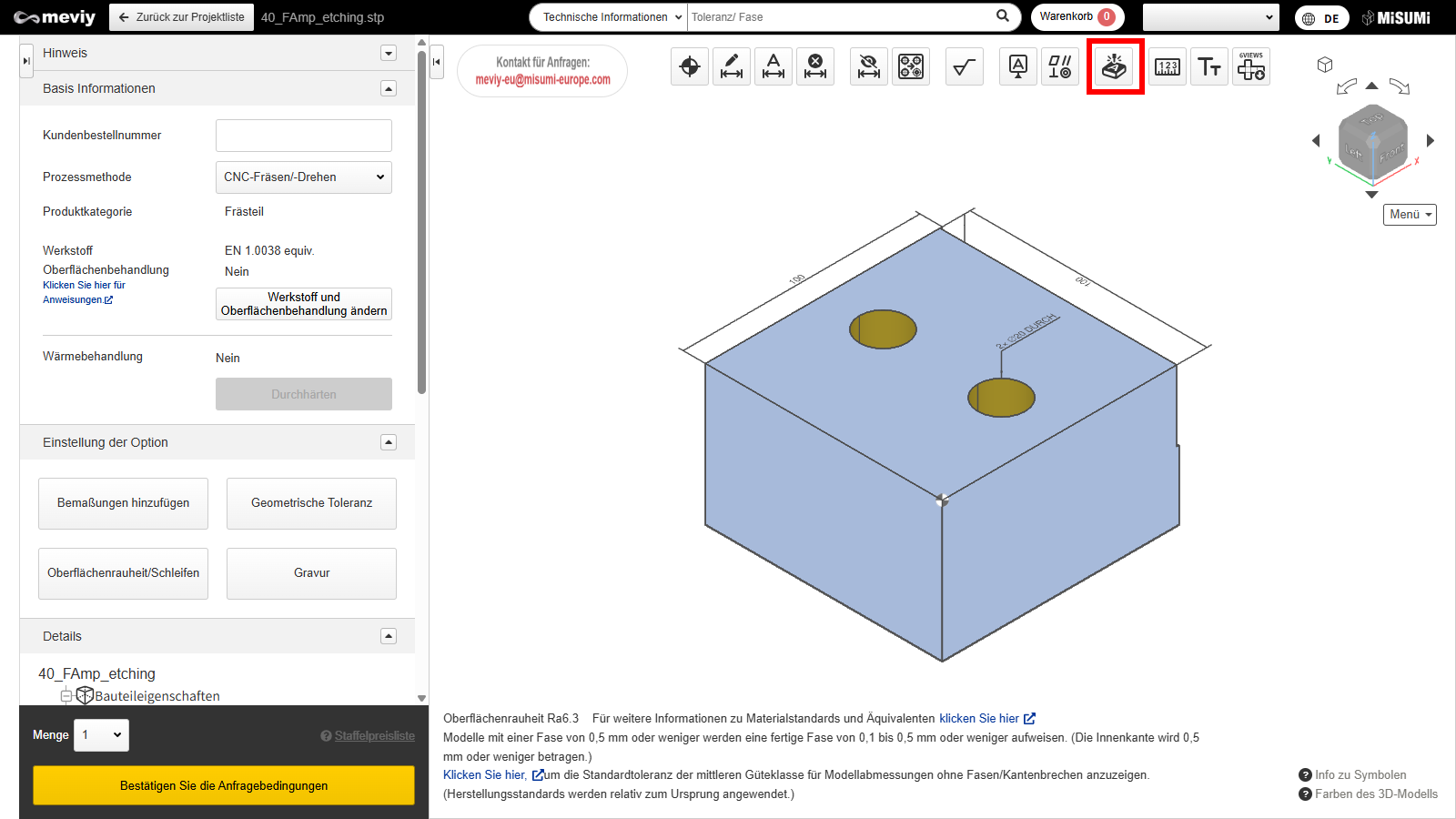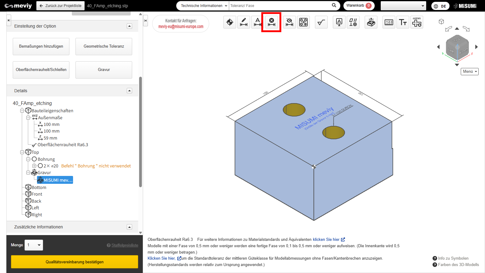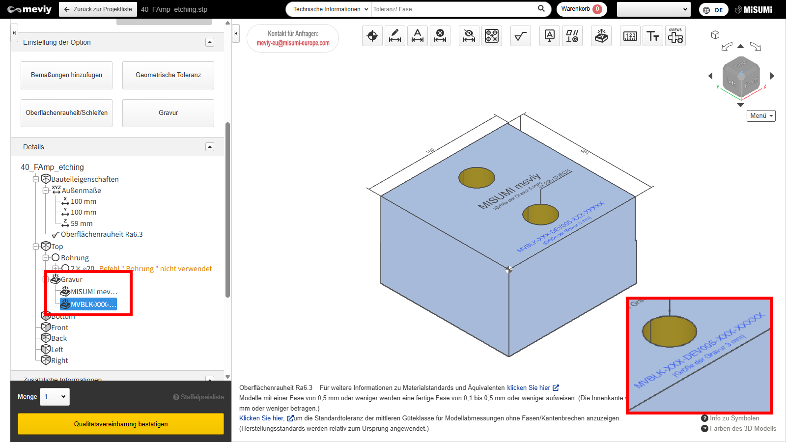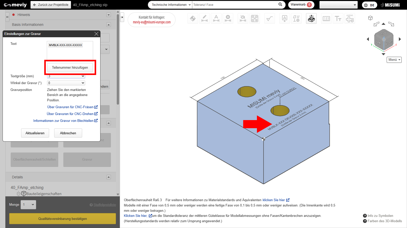 - Um die Teilnummer zu gravieren zu lassen, klicken Sie bitte auf “Teilnummer hinzufügen”. Es wird eine temporäre Teilenummer (MVBLK-XXX-XXX-XXX-XXX) vergeben und im 3D-Viewer angezeigt.