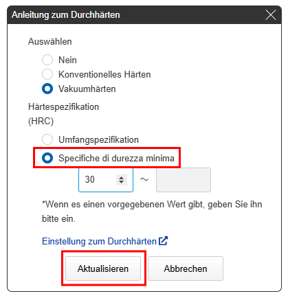 - Bei der Angabe einer Mindesthärte darf nur der niedrigste Wert für die gewünschte Härte (HRC) eingegeben werden.