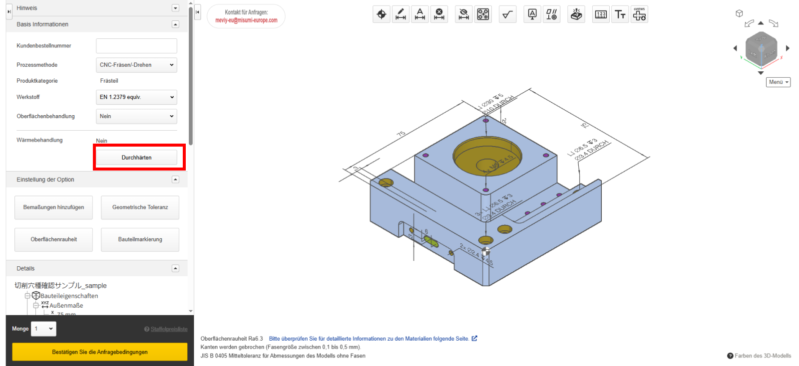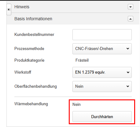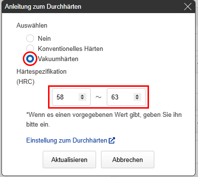 Wenn Sie eine andere Härte als die Standardhärte angeben möchten, geben Sie im Eingabefeld „Härtespezifikation (HRC)“ einen minimal und maximal Wert ein.