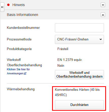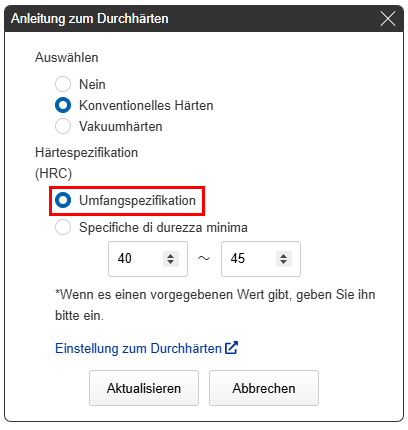 - Bei der Angabe einer Mindesthärte darf nur der niedrigste Wert für die gewünschte Härte (HRC) eingegeben werden.