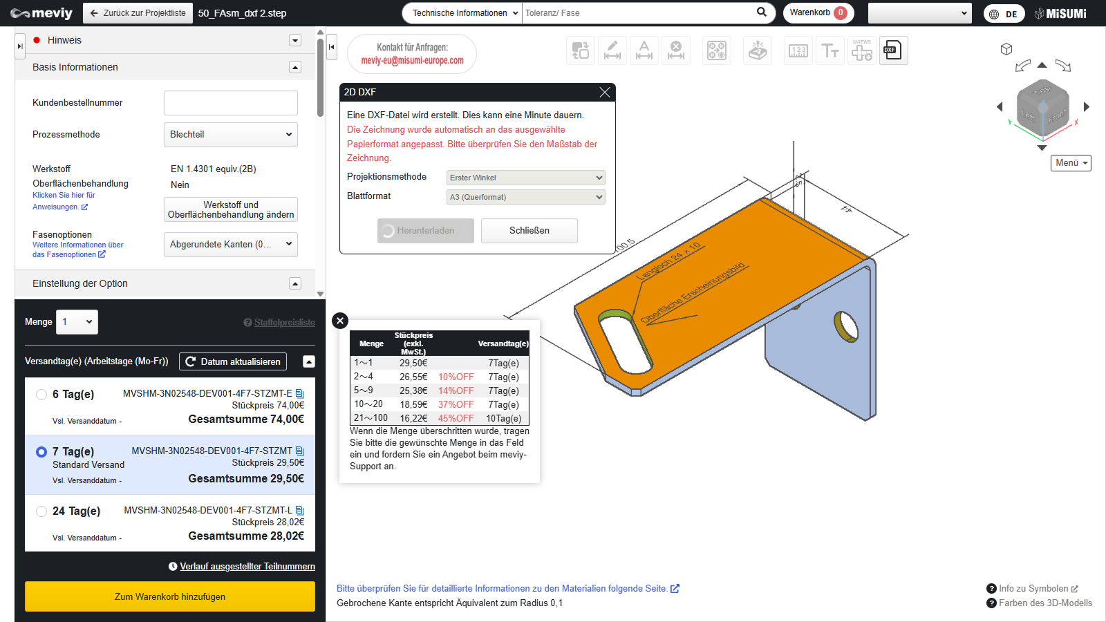 - Um die „2D DXF“-Datei herunterzuladen, müssen Sie die Angebotsbedingungen abschließen und die Teilenummer bestätigen.