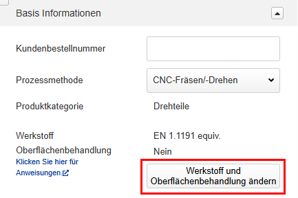 1. Klicken Sie auf [ Werkstoff und Oberflächenbehandlung ändern ].
