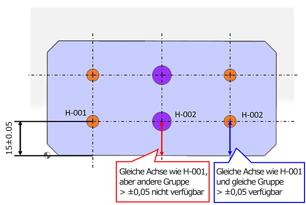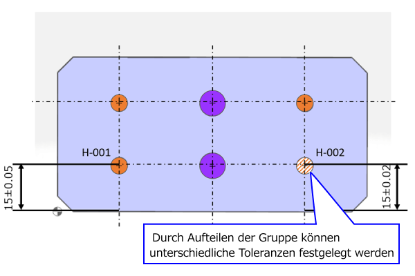 Wenn Sie unterschiedliche Maßtoleranzen für H-001 und H-002 angeben möchten, müssen Sie zunächst die Gruppe aufteilen.