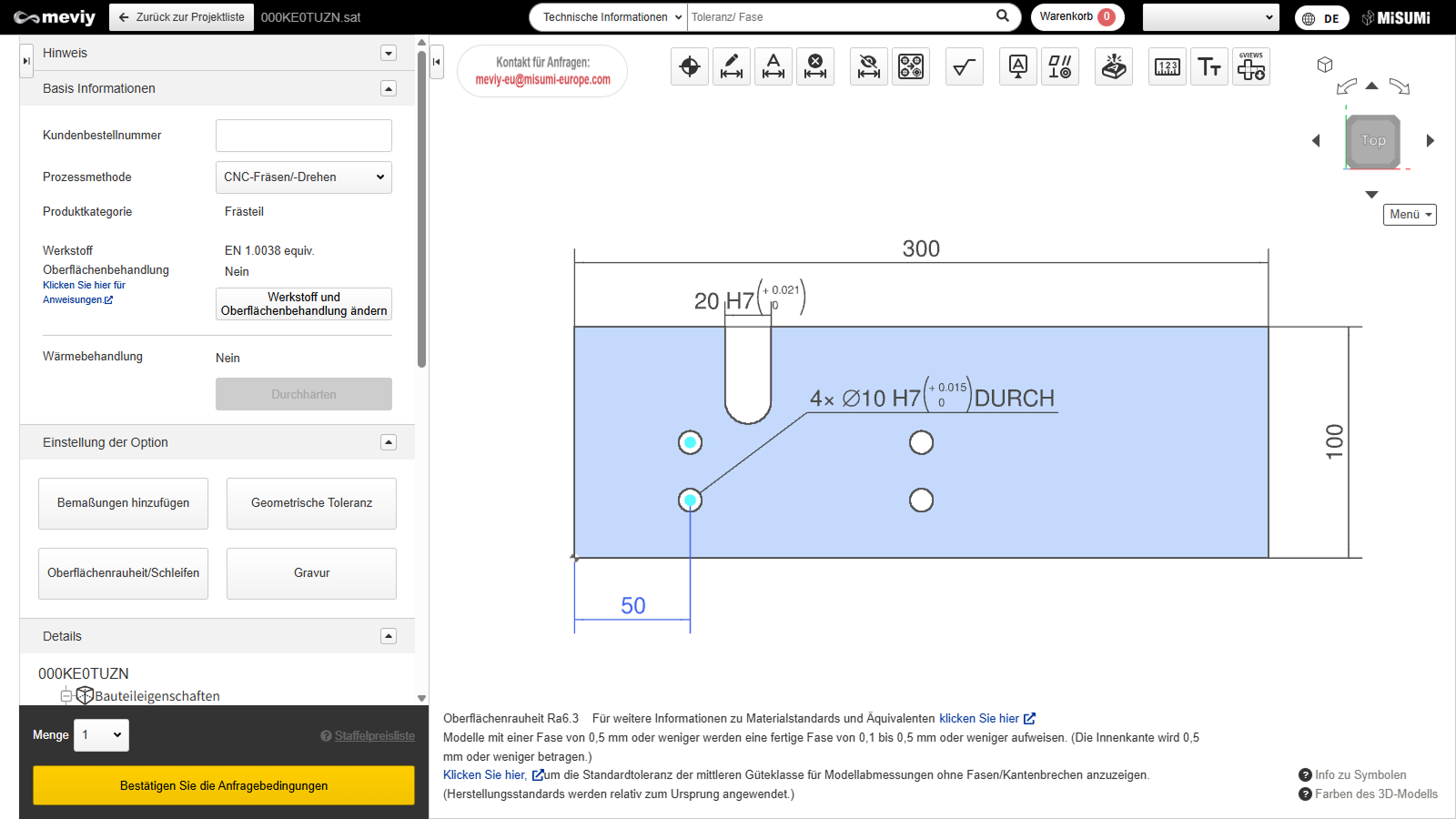 Beim Hochladen von 3D-CAD-Daten können Sie beliebige Abmessungen/Toleranzen für Teile angeben, bei denen Abmessungen und Toleranzen nicht angezeigt werden.