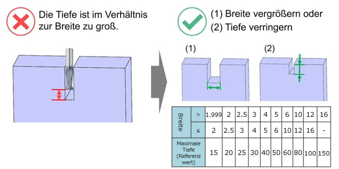 - Dieser Fehler tritt auf, wenn die angegebene Bearbeitungstiefe zu tief für die Taschenbreite ist.