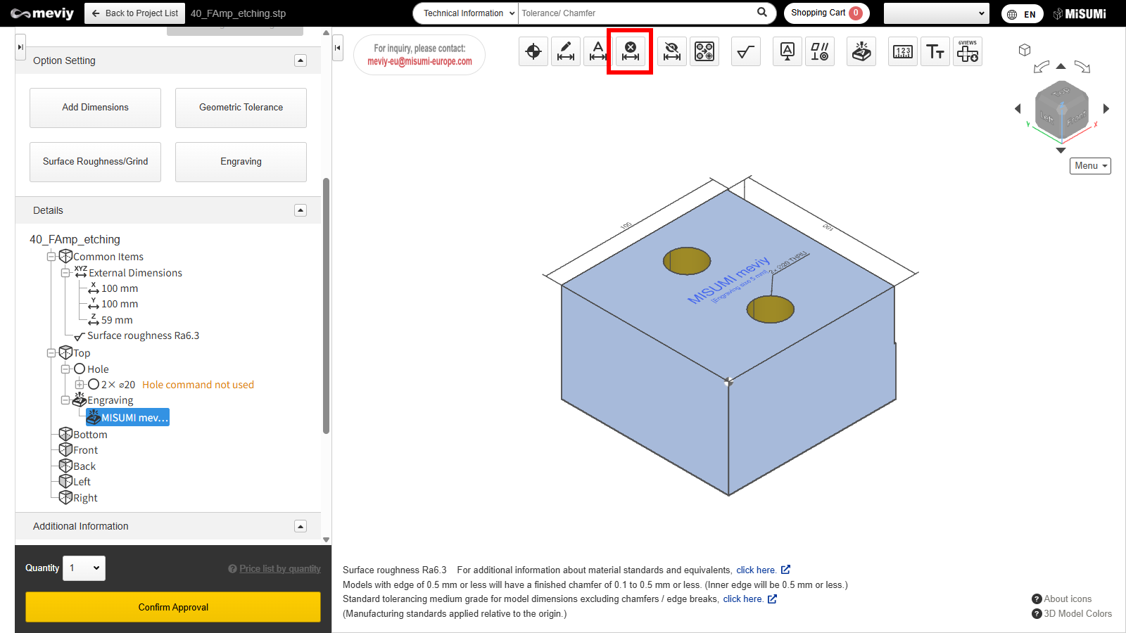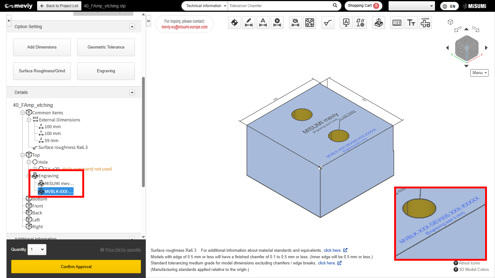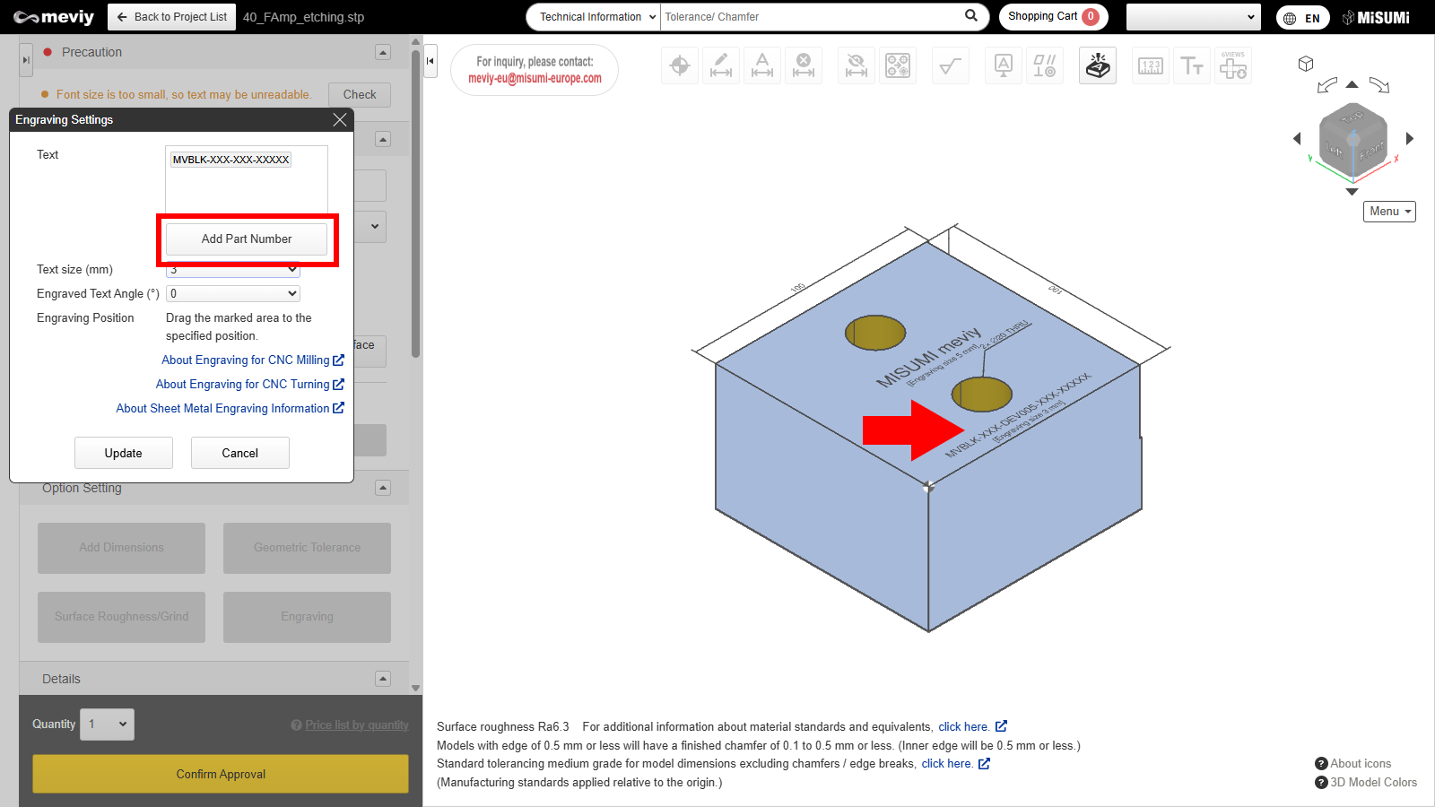 - To specify part number engraving, click “Add Part Number”. A temporary part number (MVBLK-XXX-XXX-XXX-XXX) will be issued and displayed in the 3D Viewer.