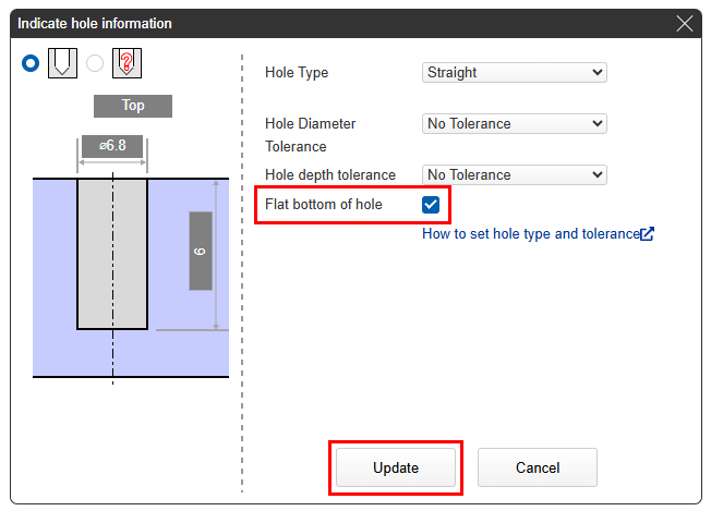 In the [Hole Information] dialog, click “Flat Bottom of Hole” and click [Update].