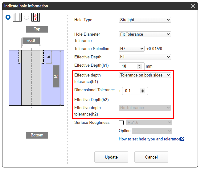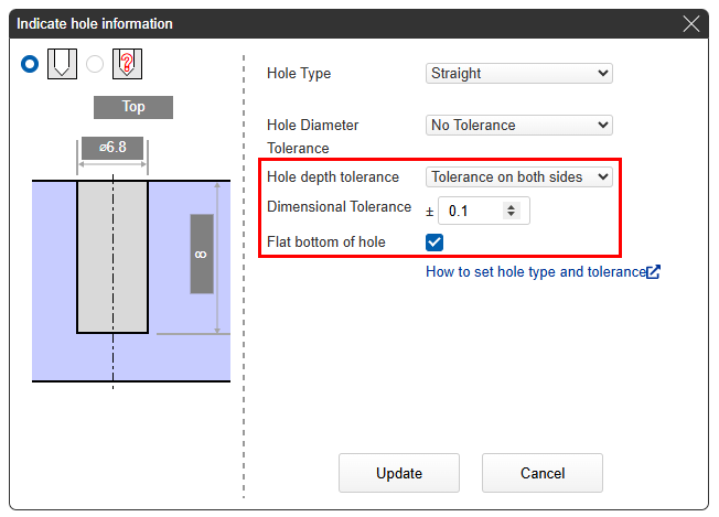 In the Hole Information dialog box, select a hole depth tolerance or an effective depth tolerance, and then click Update.