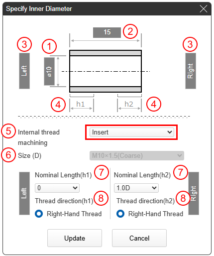 In the internal diameter information display dialog, you can select from “Straight,” “Internal Thread,” or “Insert.”