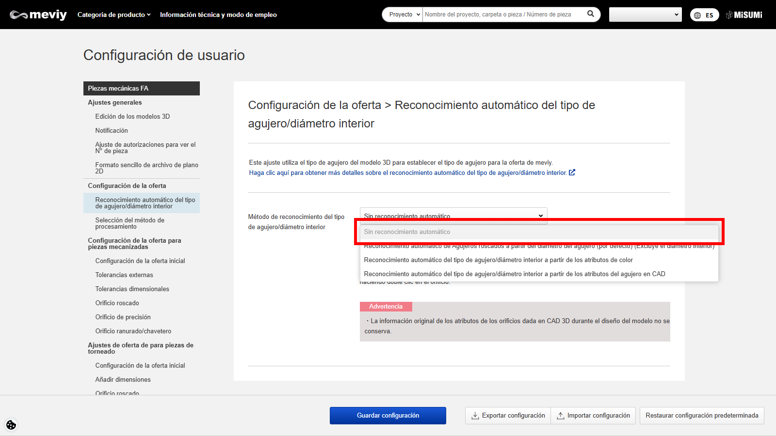 Para los modelos y formatos CAD que no son compatibles con meviy, no se garantiza el reconocimiento automático del tipo de orificio.