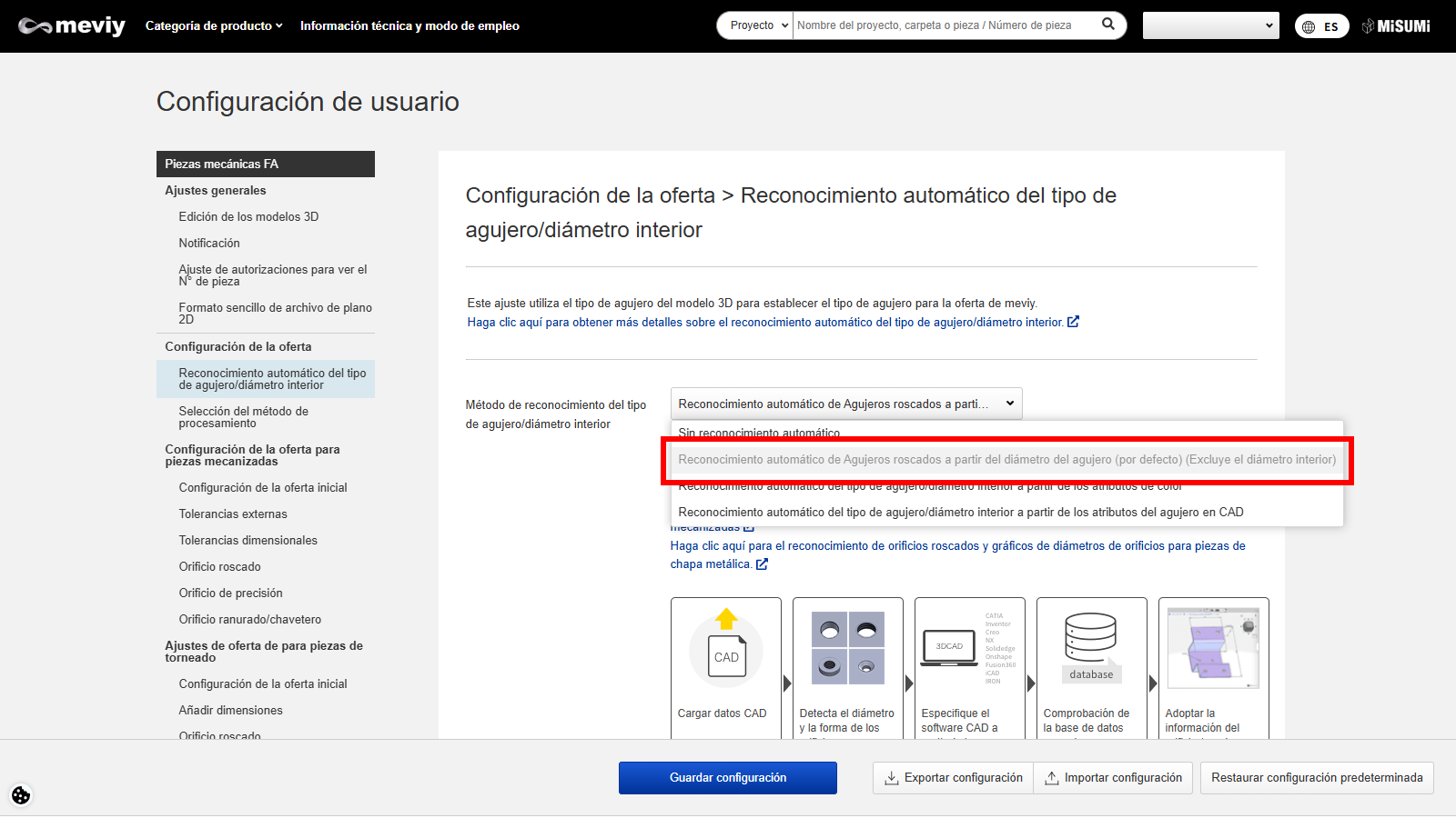 • Esta configuración detecta la forma del orificio y el «diámetro del orificio» del modelo según su software CAD y reconoce automáticamente el orificio roscado.