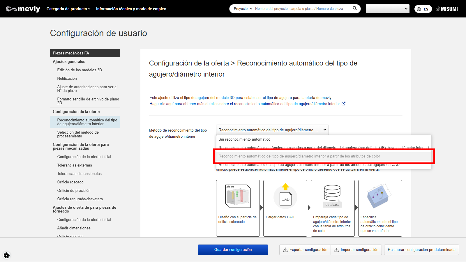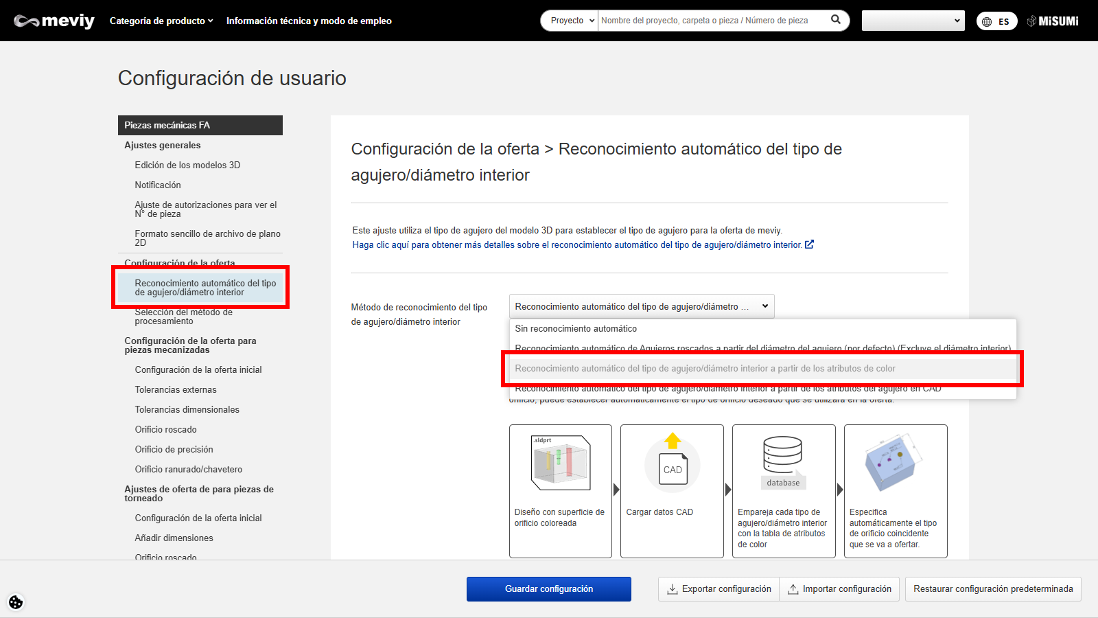 Método de configuración 3: Reconocimiento automático del tipo de orificio a partir de los atributos de color