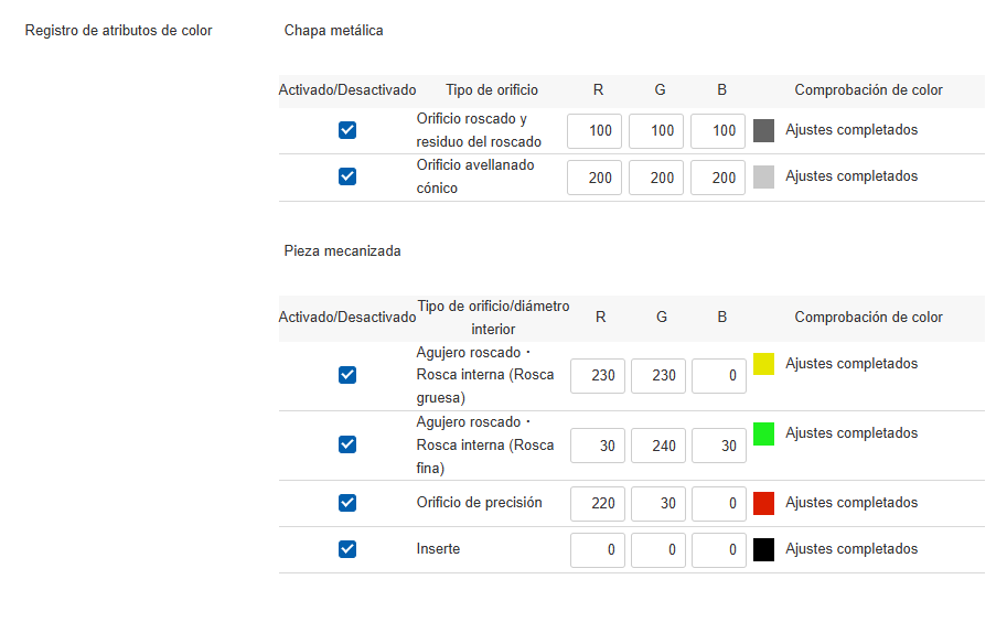 Si el ajuste de reconocimiento automático del tipo de agujero está establecido en [Reconocimiento automático del tipo de agujero a partir de los atributos de color], se puede utilizar el ajuste RGB para transferir el atributo de color de los datos CAD a meviy.