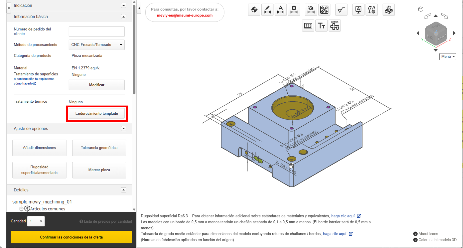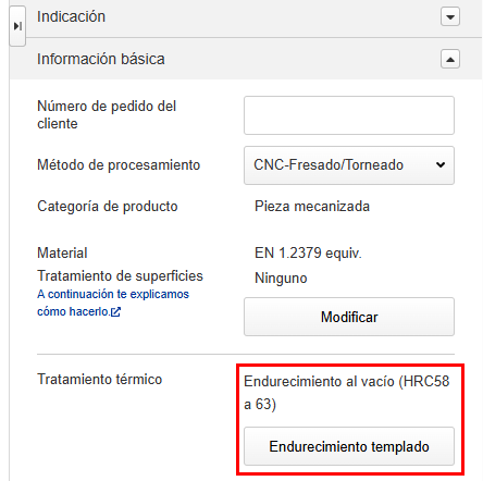 El cambio en la selección de endurecimiento se puede confirmar en la sección «Información básica» junto a «Tratamiento térmico».