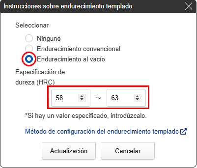 Si desea especificar una dureza diferente a la estándar, introduzca un límite inferior y un límite superior en el cuadro de entrada «Dureza (HRC)».