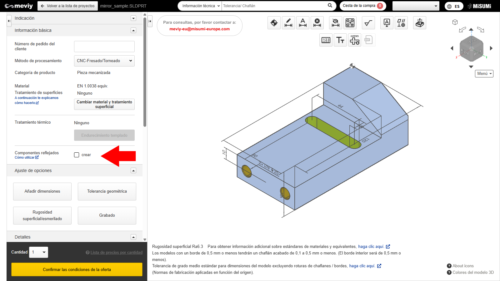 - No se puede cambiar la configuración de la pieza espejo (material, tolerancias dimensionales, tipo de orificio, etc.).