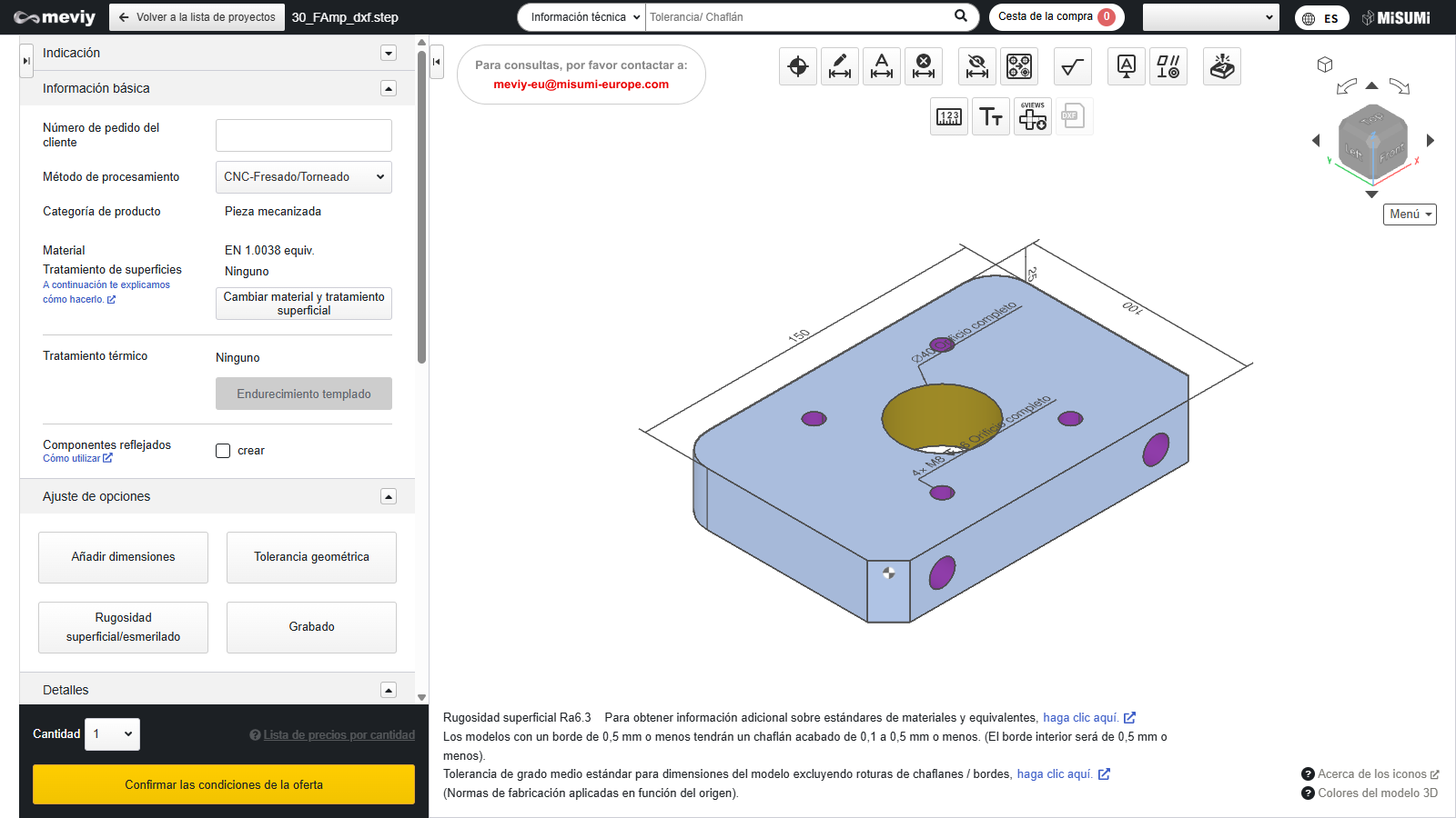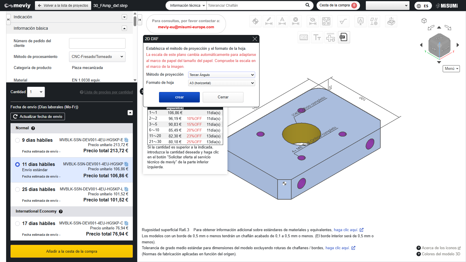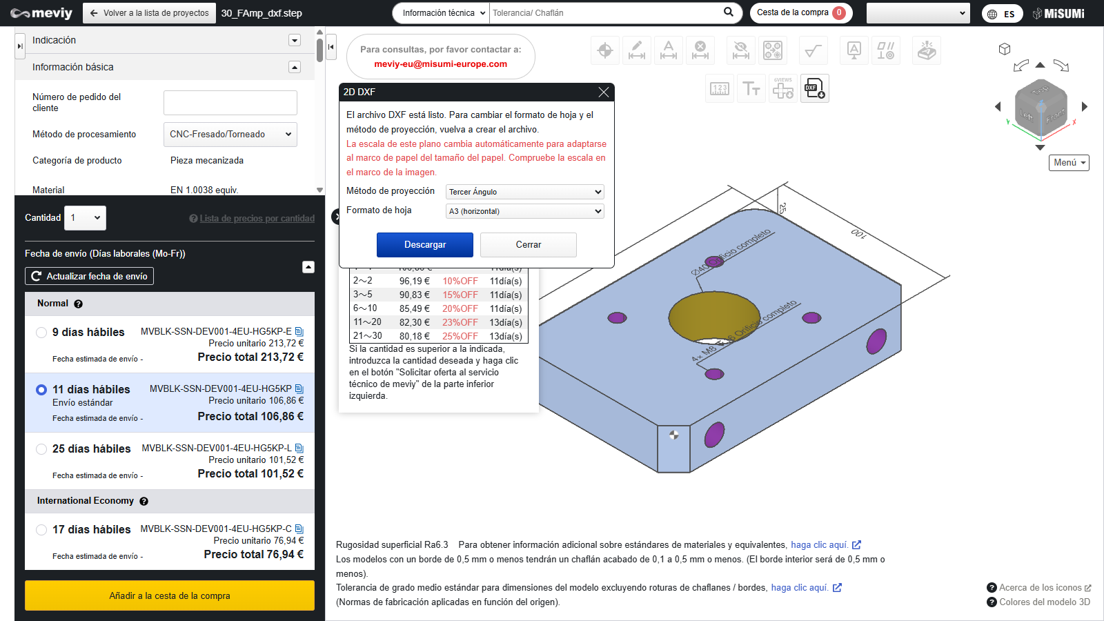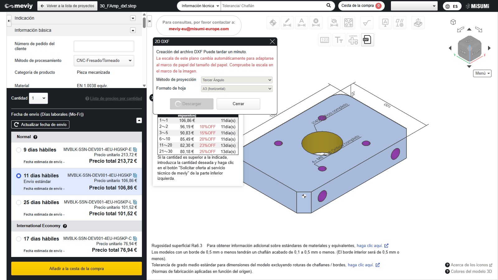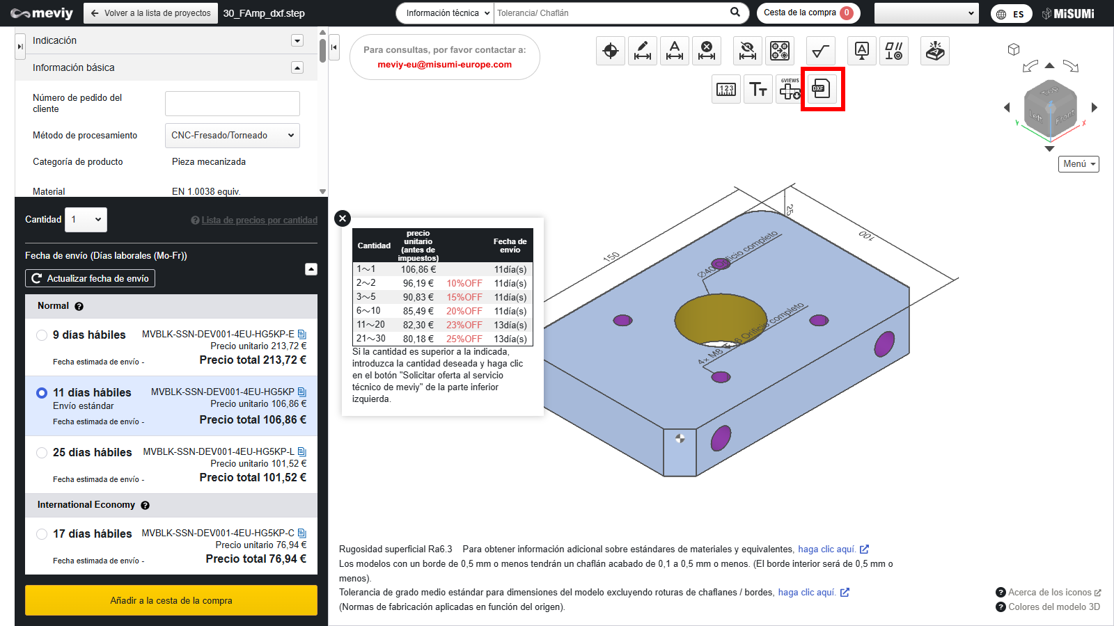 - Para descargar el archivo “DXF 2D”, es necesario finalizar las condiciones de la cotización y confirmar el número de pieza.