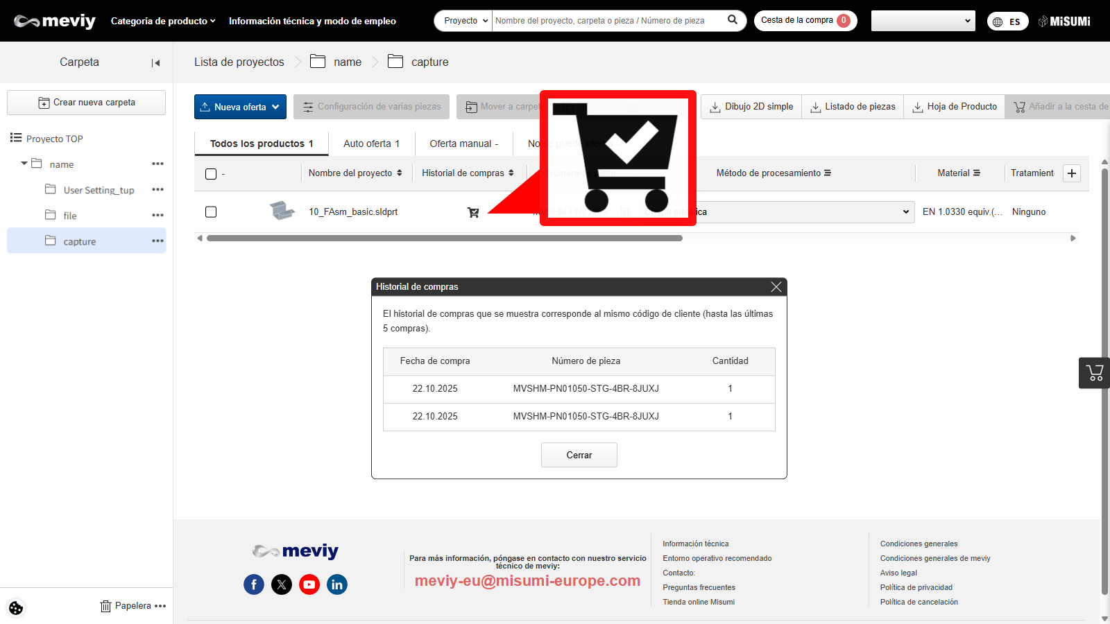 *Aunque usted no haya realizado ninguna compra, si hay una compra realizada desde una cuenta MISUMI con el mismo Código de cliente, se mostrará el historial.