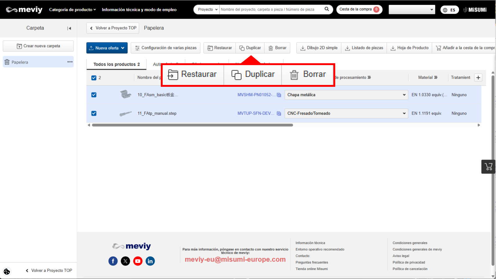 Eliminar o restaurar un proyecto en la carpeta de la papelera