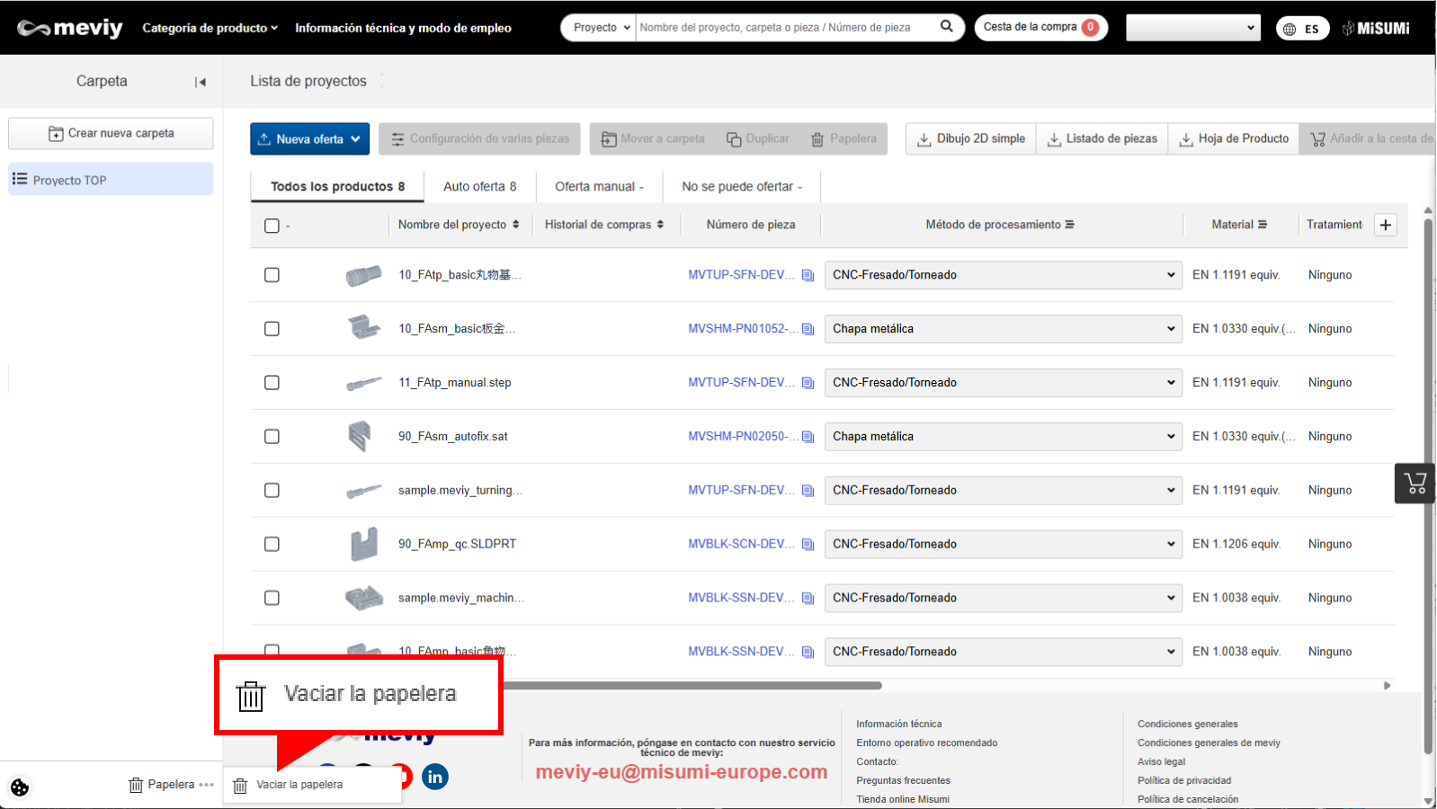 Puede eliminar todos los proyectos de la carpeta de la papelera a la vez.