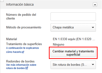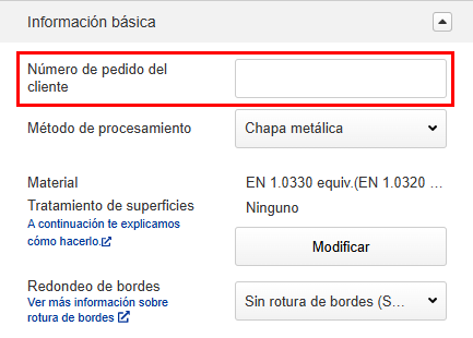 En la pestaña [información básica], puede modificar las cantidades del presupuesto, cambiar los materiales o los tratamientos superficiales, establecer números de pedido personalizados del cliente e introducir instrucciones de mecanizado adicionales. Los precios y los plazos de entrega se volverán a calcular según las especificaciones modificadas.