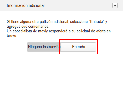 Si introduce instrucciones adicionales, no será posible realizar un presupuesto automático. Haga clic en el botón [Solicitar presupuesto manual]. Nuestro Servicio técnico de meviy se pondrá en contacto con usted.