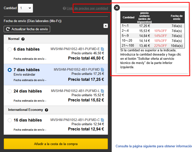 Puede comprobar el precio y la fecha de entrega para cada quantità en la «Lista de precios por quantità».