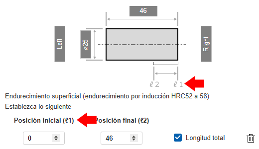 La «designación de dureza mínima» se establece introduciendo únicamente el valor mínimo de la dureza deseada (HRC).