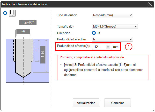 La profundidad efectiva inicial (h) del agujero roscado se puede modificarse en el cuadro de diálogo «Instrucciones sobre la información de los agujeros».