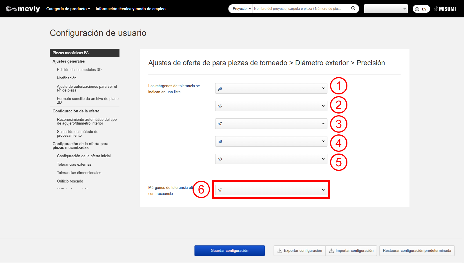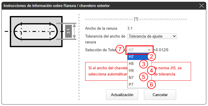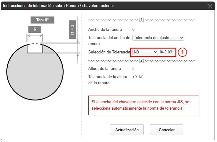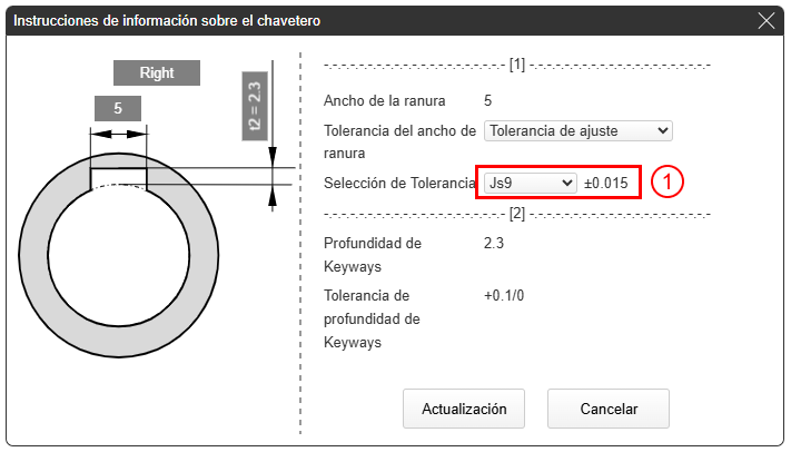 Es posible modificar el rango de tolerancia y los rangos de tolerancia utilizados con frecuencia que se muestran en la lista «Instrucciones sobre orificios asolados/chavetas».