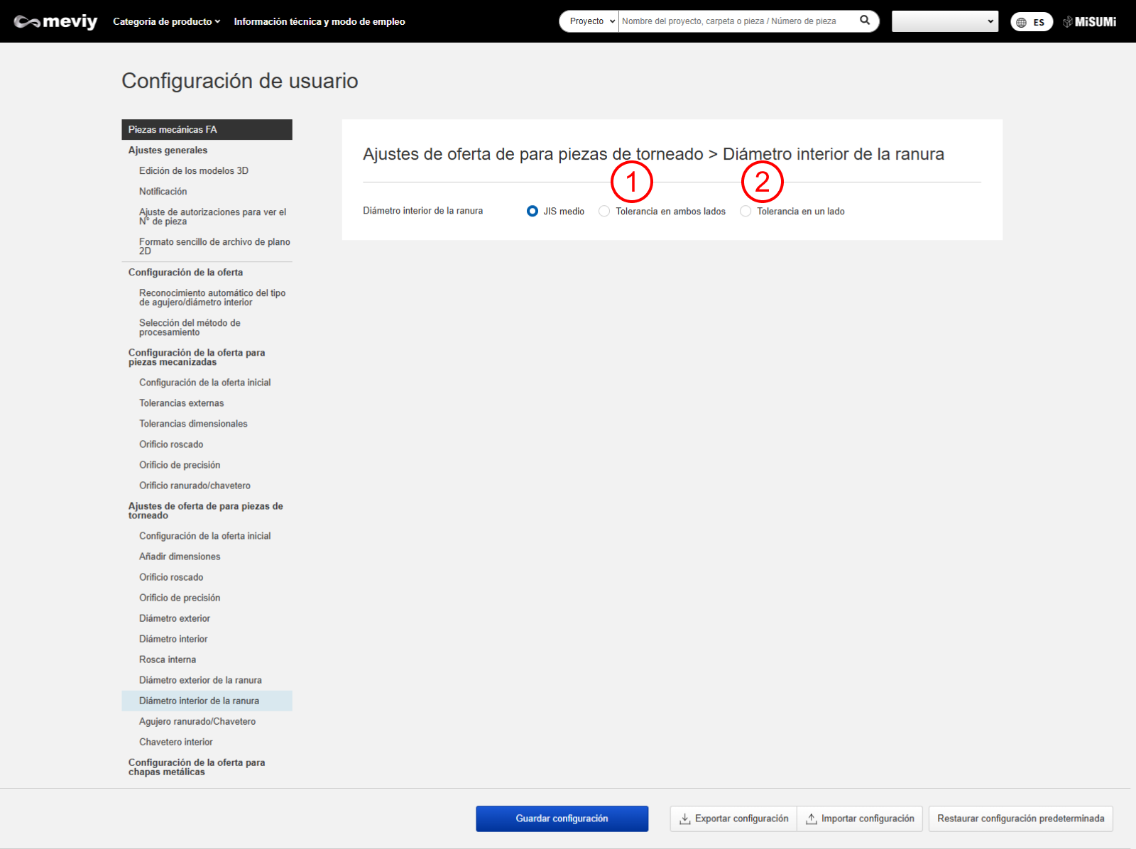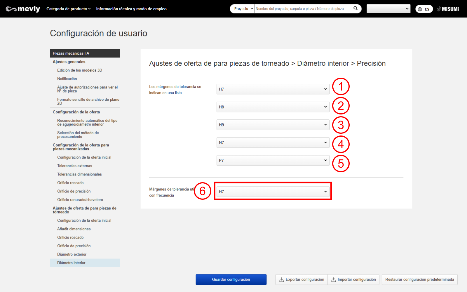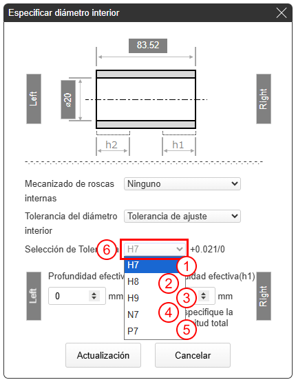 Puede cambiar el rango de tolerancia y los rangos de tolerancia utilizados con frecuencia que se muestran en la lista del cuadro de diálogo «Instrucciones sobre el diámetro interno».
