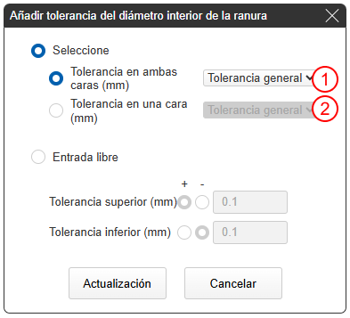 Puede cambiar la tolerancia seleccionada en el cuadro de diálogo «Añadir dimensiones del diámetro interior de la ranura».