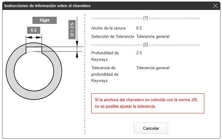 Puede cambiar los rangos de tolerancia utilizados con frecuencia que se muestran en la lista del cuadro de diálogo «Instrucciones sobre chavetas de diámetro interior».