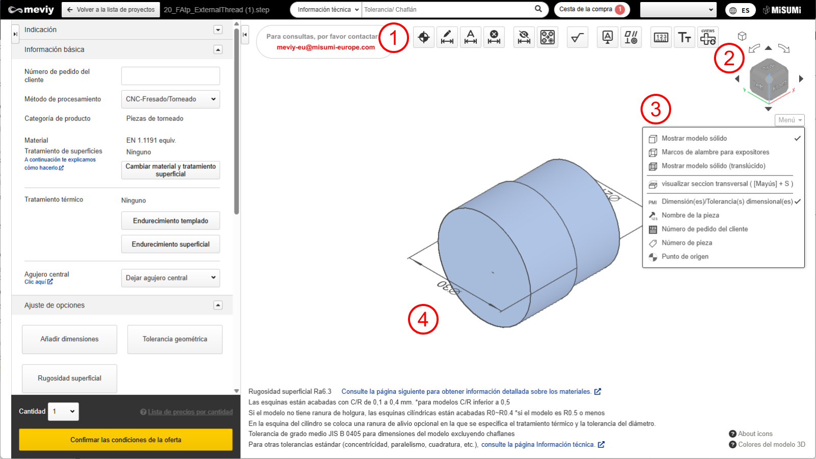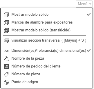 Al pasar el ratón por encima del botón «Menú» aparece un menú que permite alternar la visualización del modelo 3D y mostrar/ocultar la información de texto en el visualizador 3D.