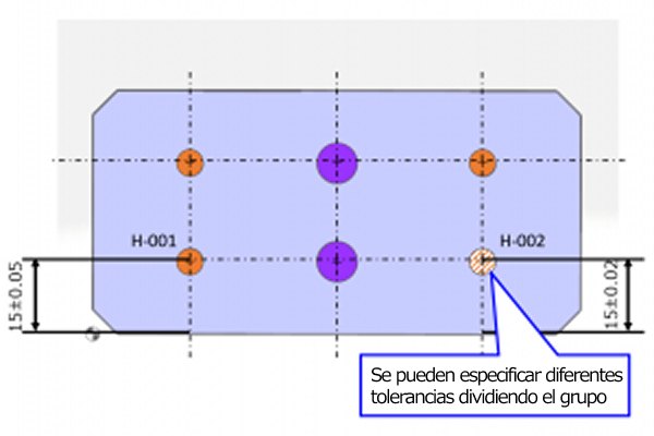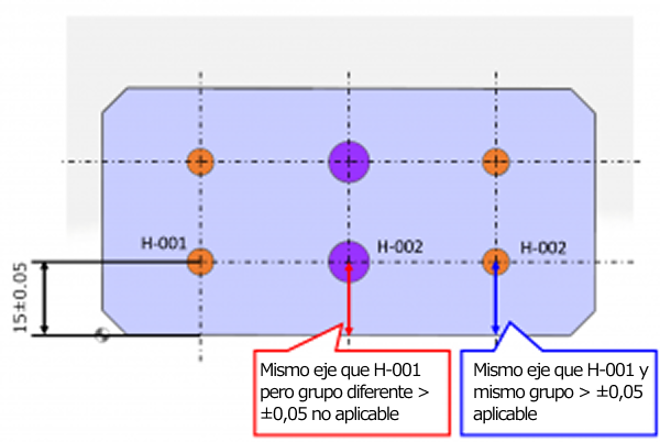 Por ejemplo, si se especifica una tolerancia dimensional para H-001, las tolerancias dimensionales también se aplicarán a H-002, que se encuentra en el mismo eje y en el mismo grupo.