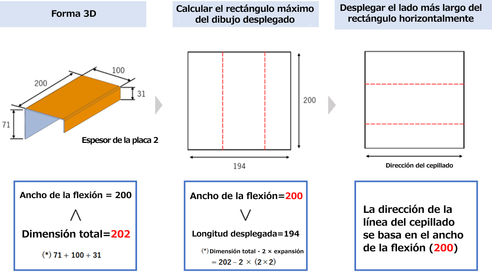 - En el caso de EN 1.4301 equiv. (acabado cepillado por una cara), la expansión es aproximadamente el doble del espesor de la placa en cada punto de flexión, por lo que las dimensiones desplegadas se acortan en esa cantidad. Como resultado, tenga en cuenta que la dirección longitudinal en el modelo 3D y el dibujo desplegado pueden diferir (véase la figura de la derecha).