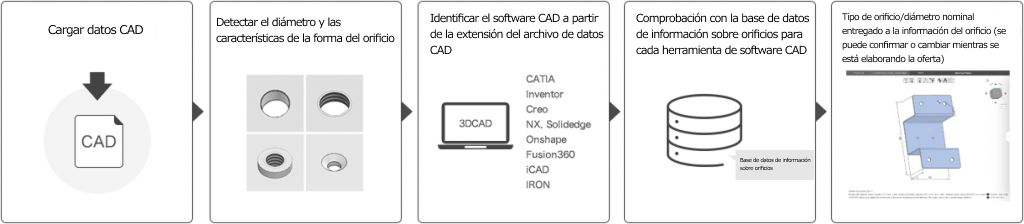 Como configuración predeterminada para el reconocimiento de orificios, se detectan las características de diámetro y forma de los orificios y se comparan con la base de datos de información sobre orificios para deducir la información sobre los orificios que se transferirá a la plataforma meviy.