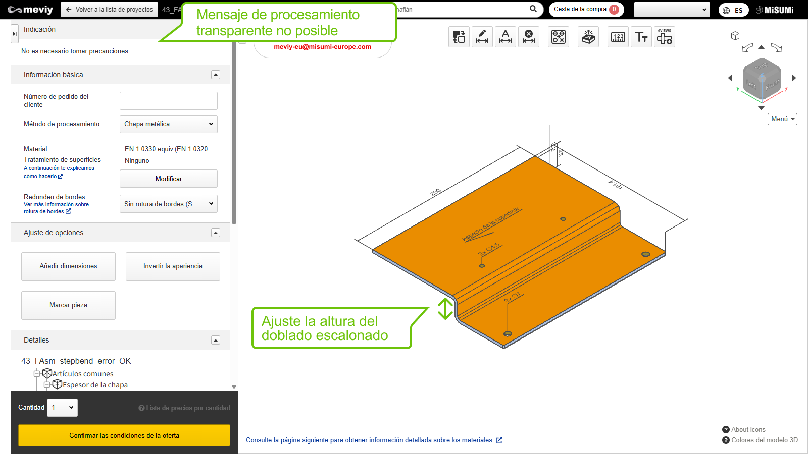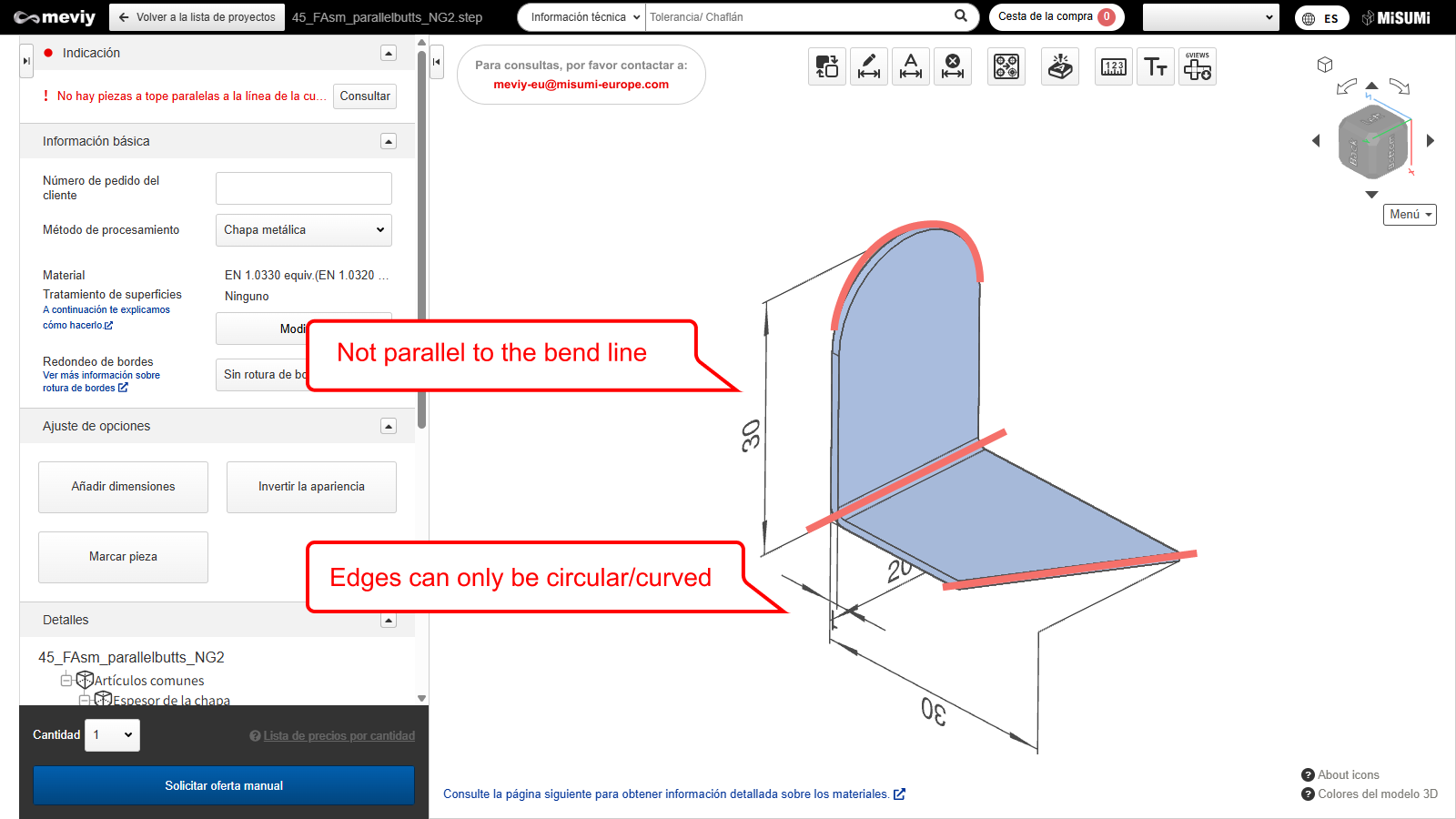 - Para las piezas de chapa metálica, la plataforma meviy realiza un análisis de interferencias para el proceso de doblado.