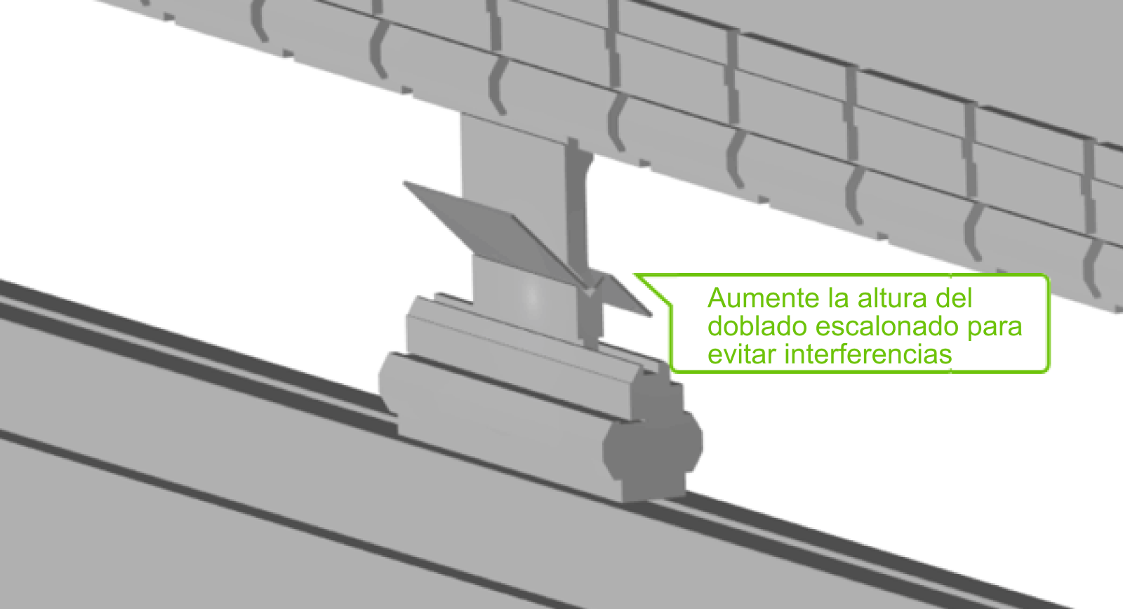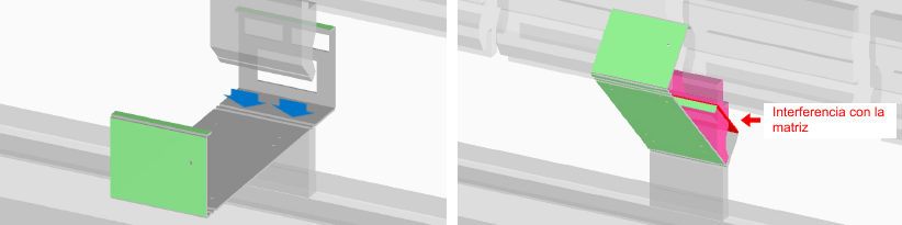 Ejemplo 4) Interferencia por doblado escalonado: ajuste la altura de doblado para eliminar cualquier interferencia (la figura de la derecha muestra la imagen del análisis).