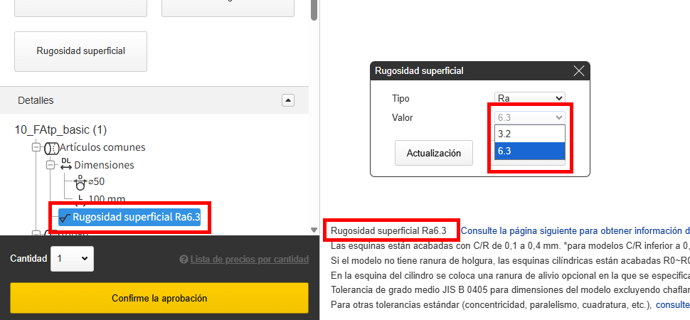Como se muestra en la figura siguiente, puede seleccionar el valor de la rugosidad superficial entre √Ra6,3 y √Ra3,2 en la vista de árbol.