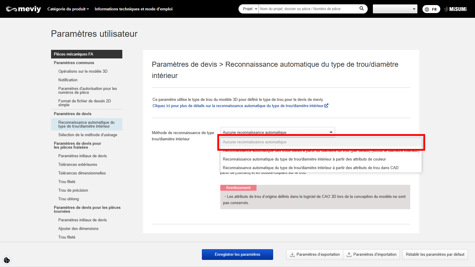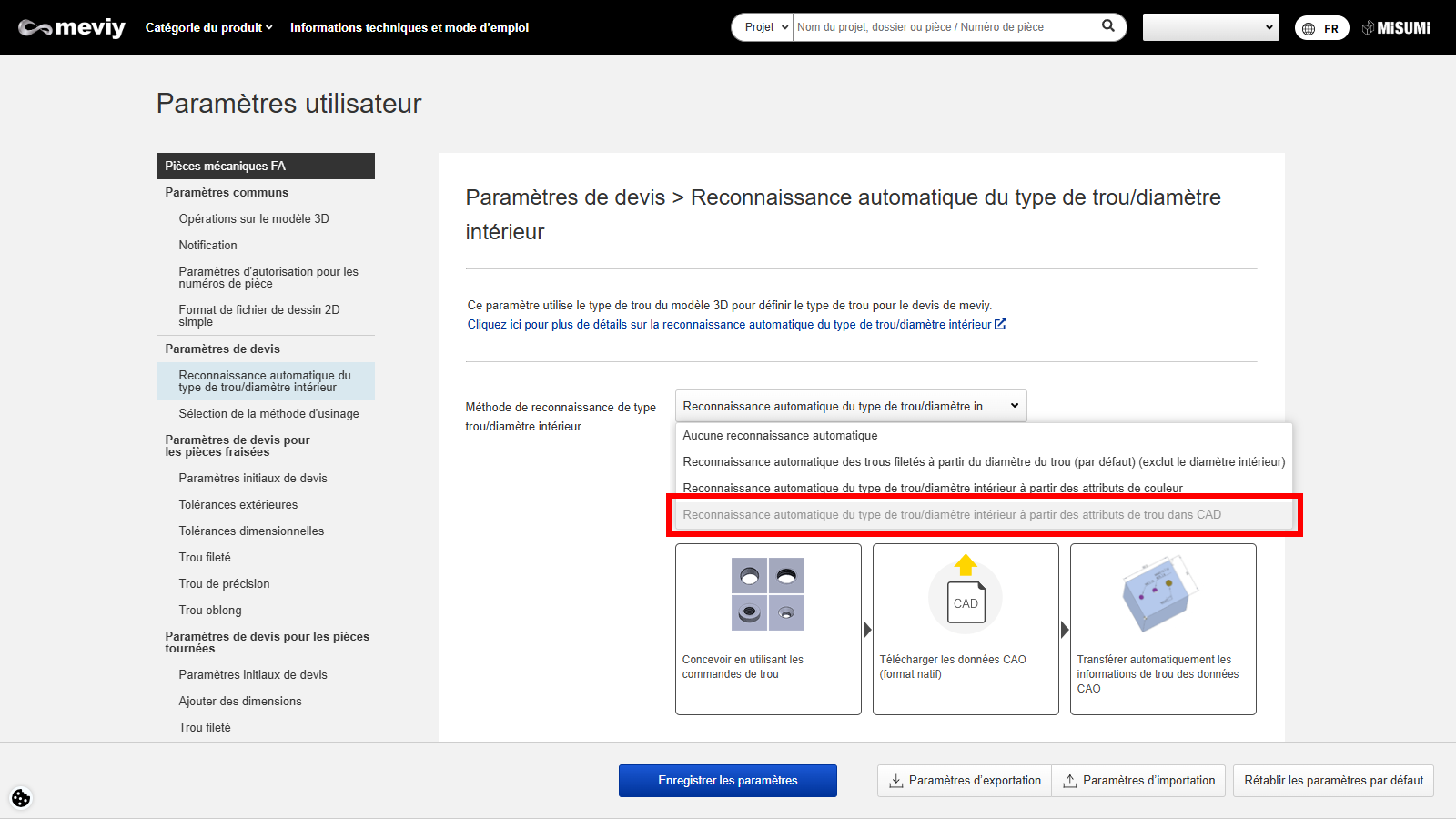 Voici 3 paramètres permettant de refléter le type de trou du modèle 3D dans le devis meviy.