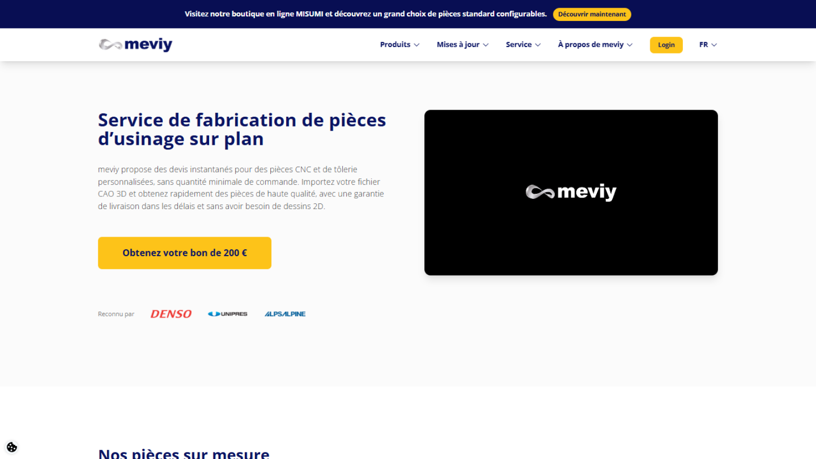 meviy est une plateforme de fabrication de nouvelle génération qui vous permet d’obtenir des devis instantanés en téléchargeant simplement des données CAO 3D sur meviy. Une réduction significative des délais de livraison signifie une amélioration considérable du rendement pour les concepteurs et les services achats. Outre les processus d’usinage par découpe, tôlerie et tournage, une large gamme de matériaux et de traitements de surface est prise en charge. La plateforme meviy prend en charge les gabarits et les machines, le développement de produits et les processus de conception de moules.