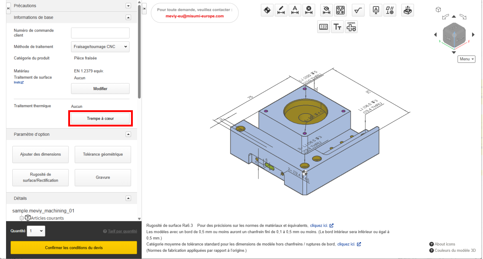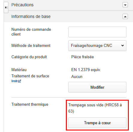 Il est possible de confirmer la modification de la sélection de trempe dans la section « Informations de base » à côté de « Traitement thermique ».