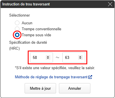 Si vous souhaitez spécifier une dureté différente de la dureté standard, saisissez une limite inférieure et une limite supérieure dans la zone de saisie « Dureté (HRC) ».