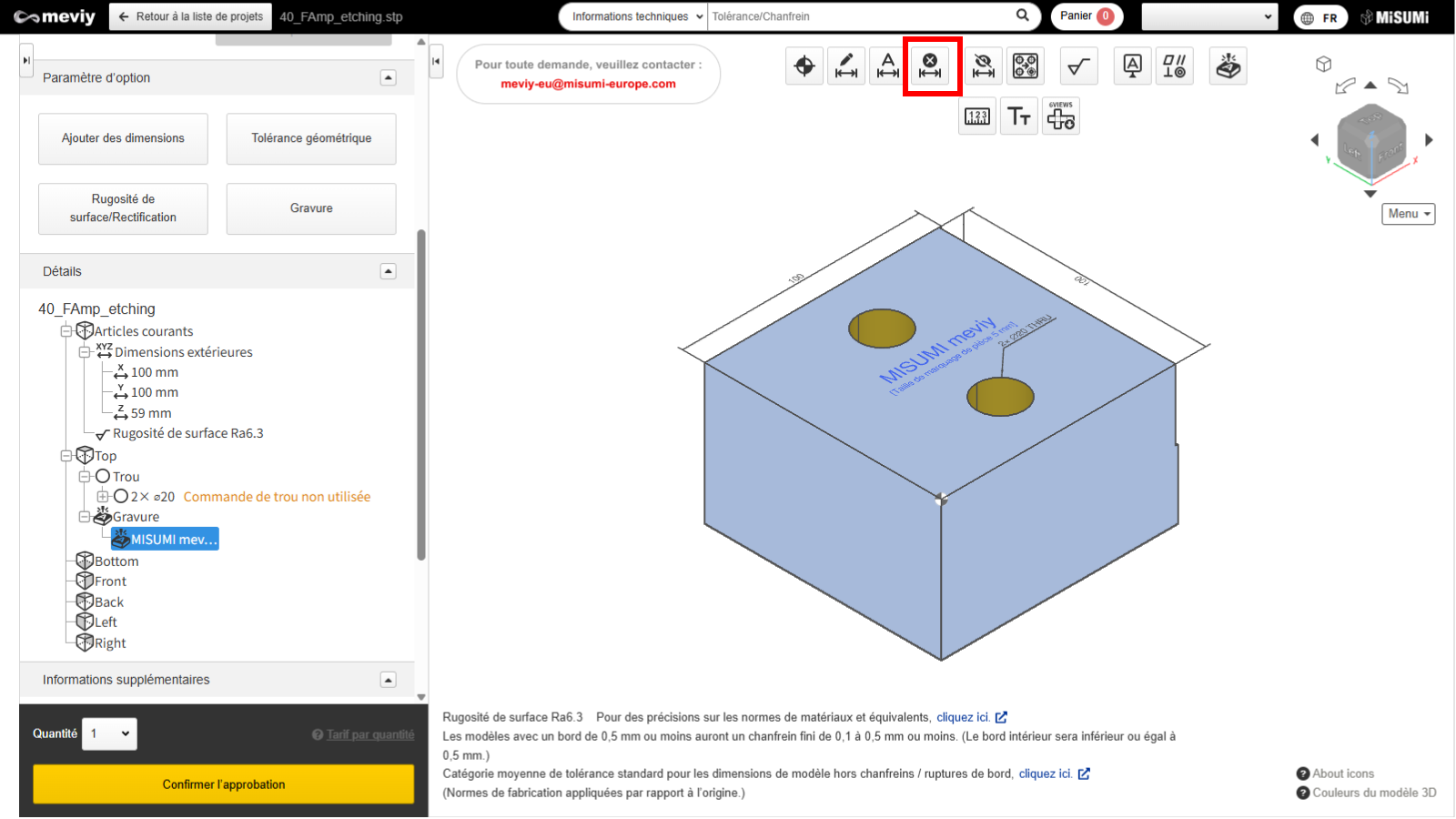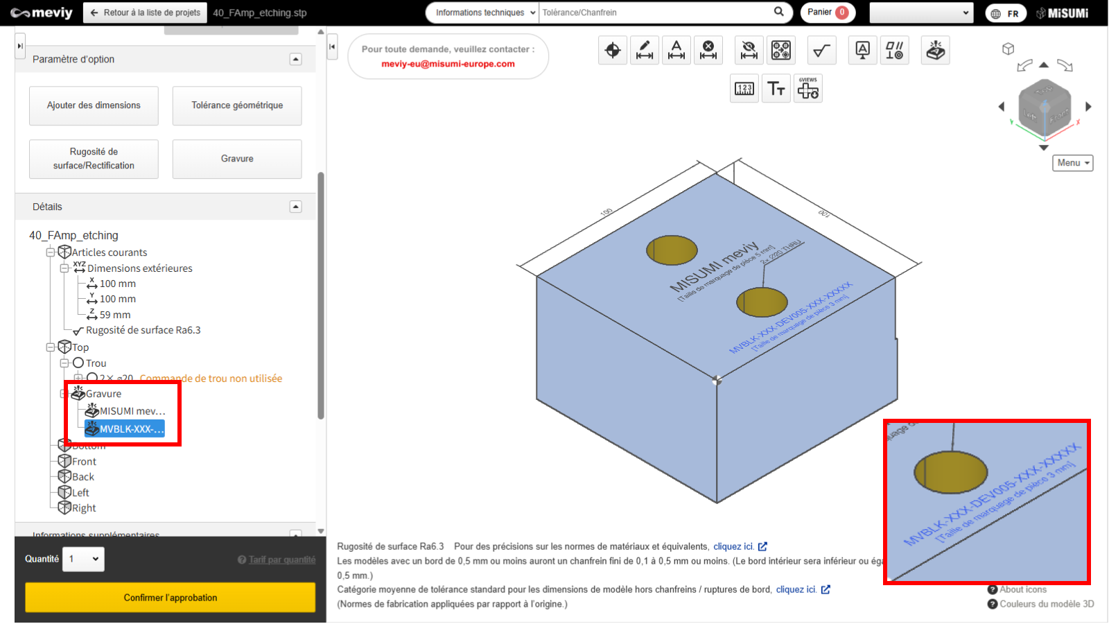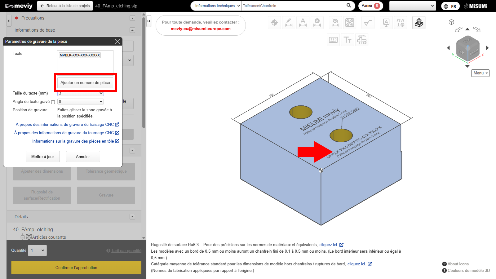 Pour spécifier la gravure du numéro de pièce, cliquez sur « Ajouter un numéro de pièce ». - Un numéro de pièce temporaire (MVBLK-XXX-XXX-XXX-XXX) sera attribué et affiché dans la Visionneuse 3D.